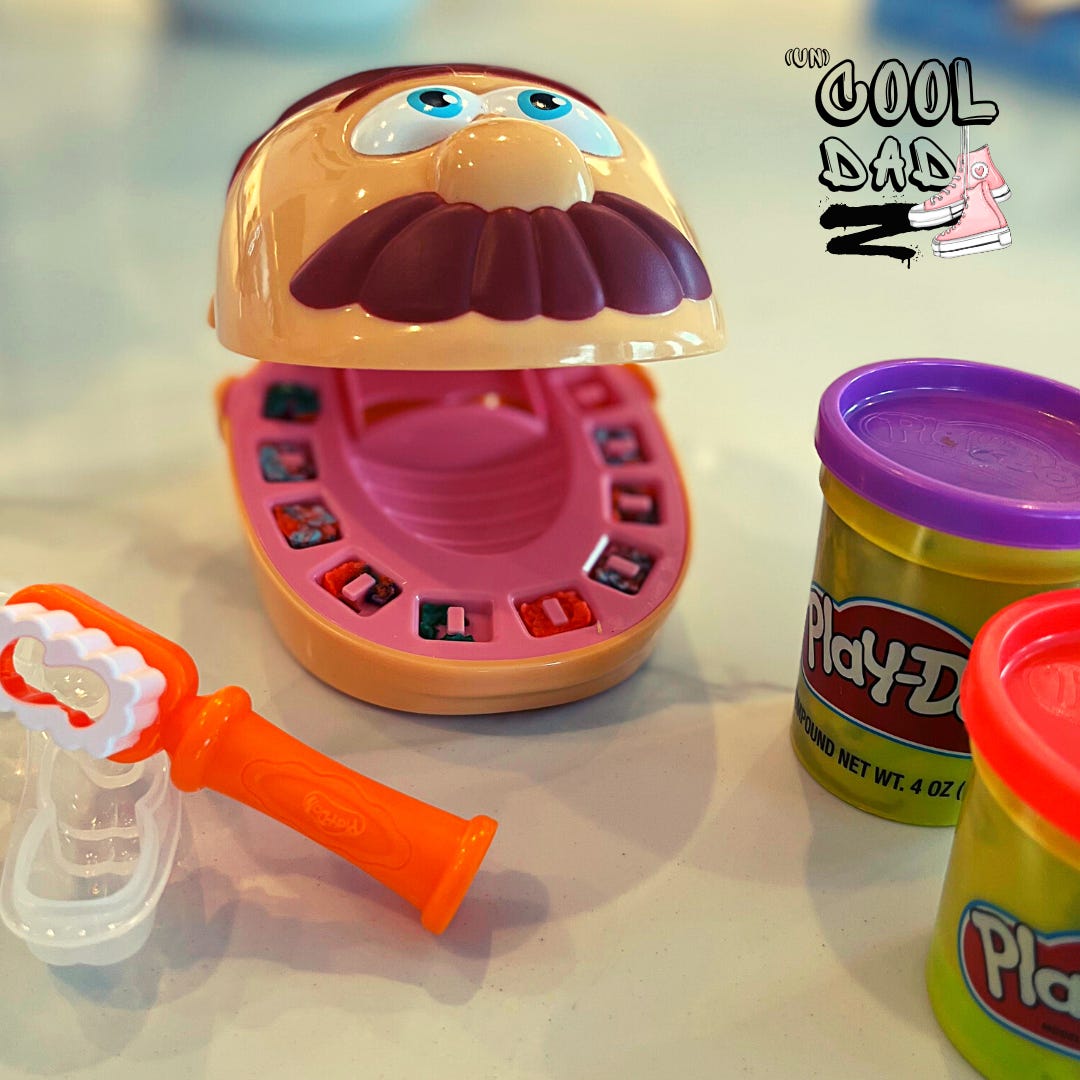 And while she always loved spreading Play-doh throughout the house akin to a Jackson Pollock classic, she rarely (if ever) picked it up. This, of course, resulted in a war-torn living room replete with rainbow shrapnel ready to impale an unknowing sole without warning. And then it was the odd themes and products that would magically appear after birthday parties and grandparent visits. Bodily fluids like slime snot or tightly-coiled emoji poops is enough to bring out the five-year-old in all of us, but it was the Dr. Drill ‘n Fill set that would really flummox me as I would vacuum up his molars and fillings after bedtime. Kids were invited to play dentist as they repaired cavities, customized braces and root-canaled their way to glee on a mustachioed detached head. Classic nightmare fuel. But back to my story…